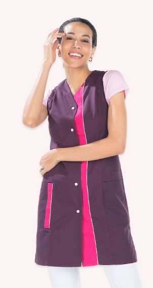Tunique femme, manches courtes avec fente, fermeture par pressions, 2 poches basses, 2 poches BIP, fentes côtés, longueur 85 cm