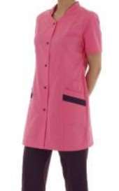 Tunique femme, manches courtes, coupe ajustée, fermeture par pressions, 2 poches basses, 2 poches BIP, fentes côtés, longueur 85 cm