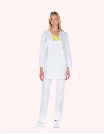Tunique femme, manches longues tranformables, coupe ajustée, fermeture latérale par pressions, 2 poches basses, 1 poche poitrine, longueur 80 cm