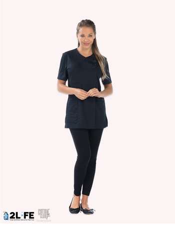 Tunique femme, manches courtes, fermeture latérale par pressions sous patte, 2 poches basses, 1 poche BIP, 1 poche poitrine, fentes côtés, longueur 75 cm