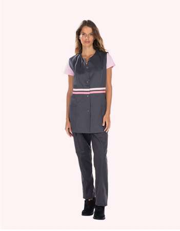 Tunique femme, sans manches, fermeture par pressions, 2 poches basses, longueur 75 cm