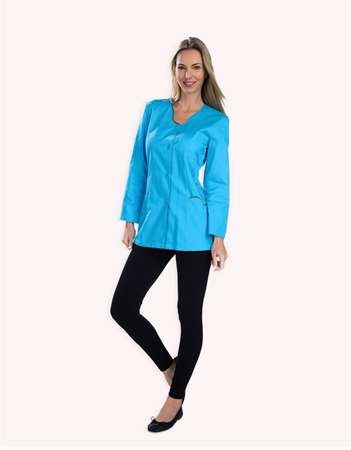 Tunique femme, manches longues transformables, fermeture par pressions, 2 poches basses, 1 poche BIP, 1 poche poitrine, 2 fentes dos, longueur 75cm