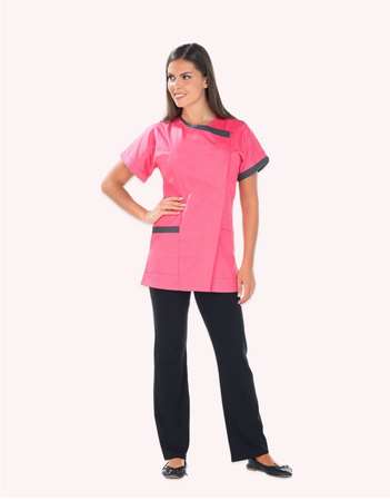 Tunique femme, manches courtes kimono, fermeture latérale par pressions sous patte, 2 poches basses, 2 poches BIP, 1 poche stylo sur manche gauche, fentes côtés, longueur 75 cm