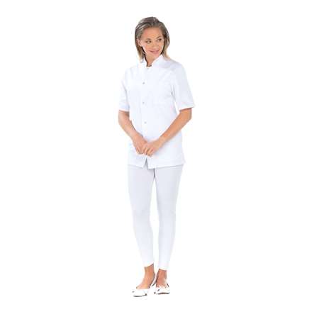 Tunique, manches courtes, fermeture par pressions, 2 poches basses, 1 poche poitrine, fentes côtés, longueur 75 cm