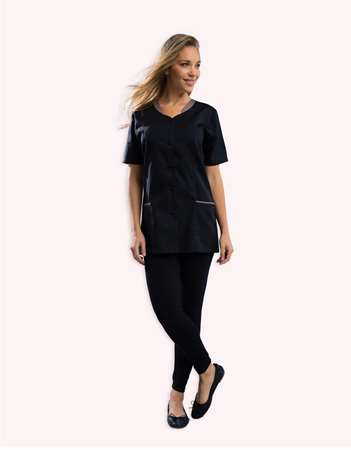 Tunique femme, manches courtes, fermeture par pressions, 2 poches basses, 1 poche poitrine, longueur 75 cm