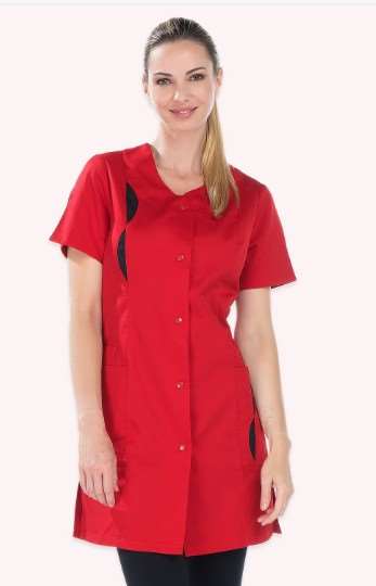 Tunique femme, manches courtes avec fente, fermeture par pressions, 2 poches basses, 2 poches BIP, fentes côtés, longueur 85 cm