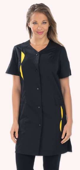 Tunique femme, manches courtes avec fente, fermeture par pressions, 2 poches basses, 2 poches BIP, fentes côtés, longueur 85 cm